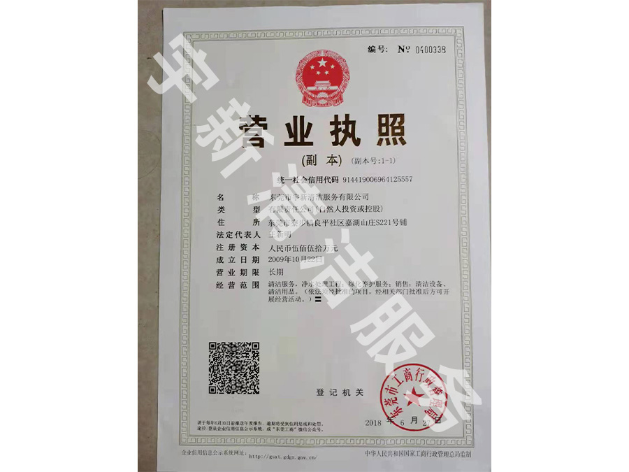東莞市宇新清潔服務(wù)有限公司是一家專業(yè)化、多元化、先進(jìn)化的清潔、清洗服務(wù)有限公司。注冊資金550萬元,經(jīng)東莞市行政管理局批準(zhǔn)、注冊的有限責(zé)任公司。