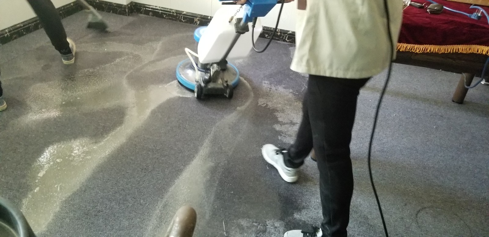 2.將地毯清潔劑、化油劑按比例加水稀釋好并注入發(fā)泡箱用“Z”字型均勻清洗地毯,清洗同時(shí)使用大功率吸水機(jī)將地毯中的水漬吸出。